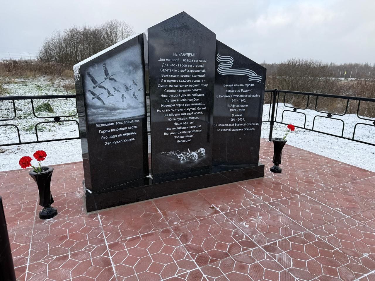 Этот памятник – дань глубокого уважения и благодарности от жителей деревни Войново всем, кто не вернулся с полей сражений Великой Отечественной войны, погиб в Афганистане, Чечне и в ходе Специальной военной операции.